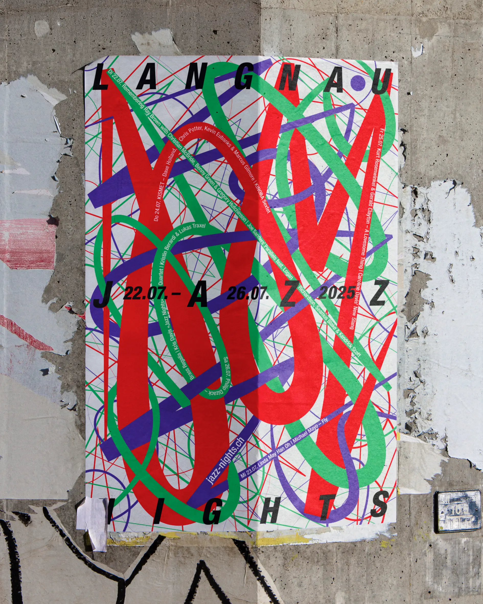 Every year, Langnau Jazz Nights transforms the Emmental region into a vibrant centre of international jazz culture. This lively atmosphere is reflected in the heart of the visual identity: the main visual shows the three intertwined words – Langnau, Jazz and Nights – as a playful, multi-layered network. In the background, different lines of varying thickness symbolise the space in which the music unfolds. The main visual stands for improvisation, rhythm and versatility of jazz and forms the basis for the entire visual identity of the festival. The design conveys complexity and excitement without losing the joy of playing and liveliness. The visual identity thus reflects the creative energy and character of the Jazz Nights on all levels.