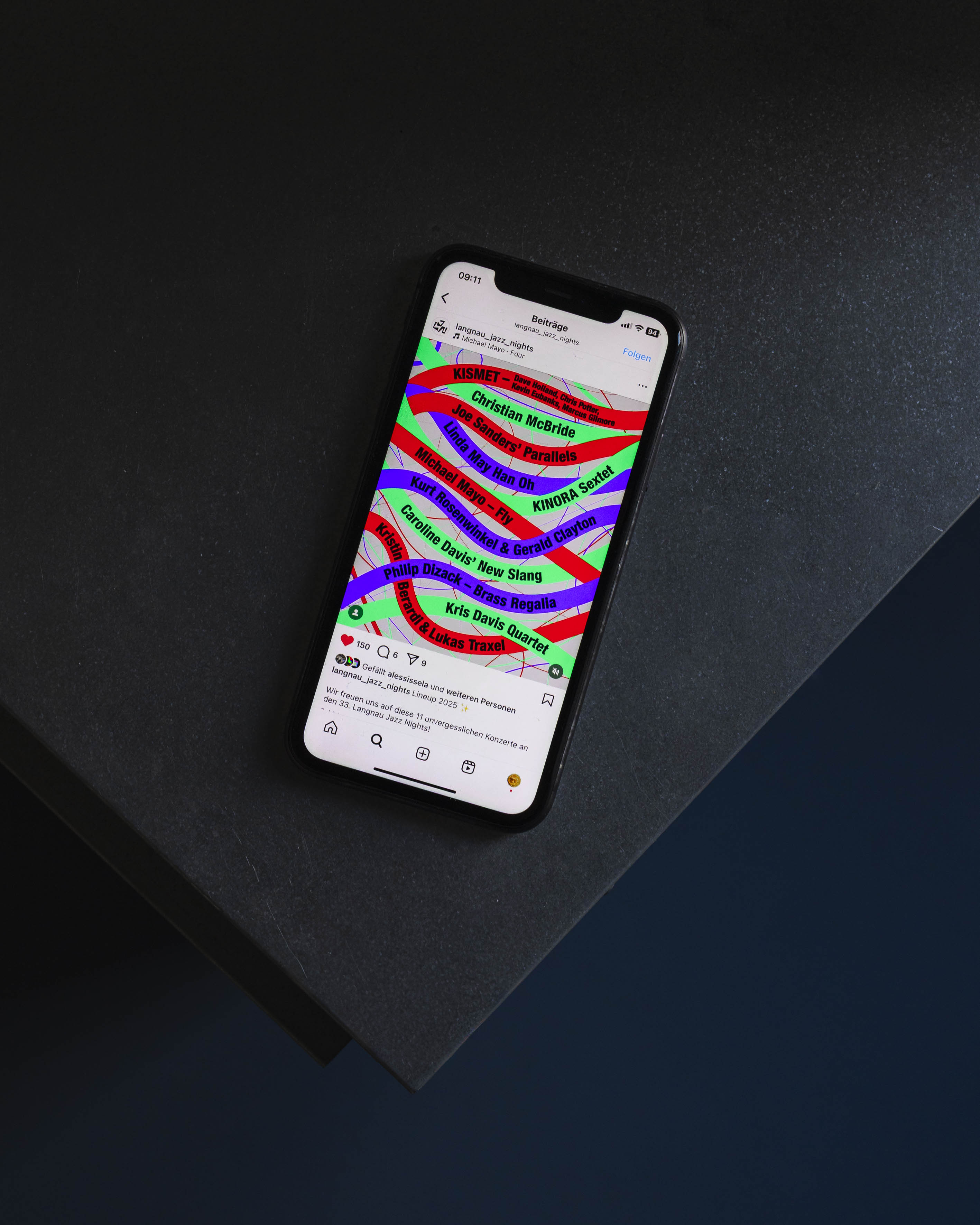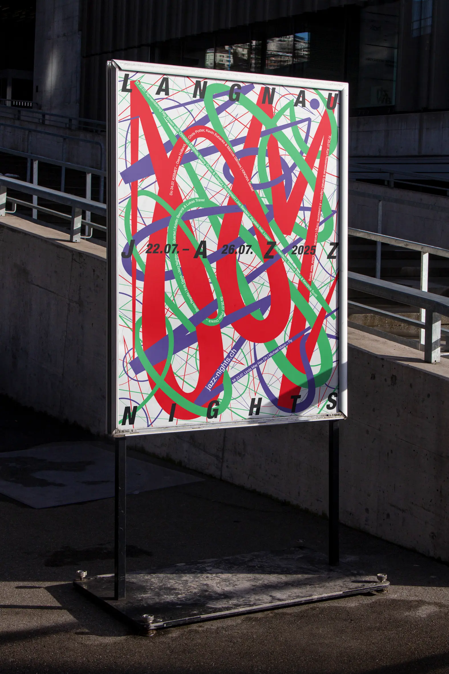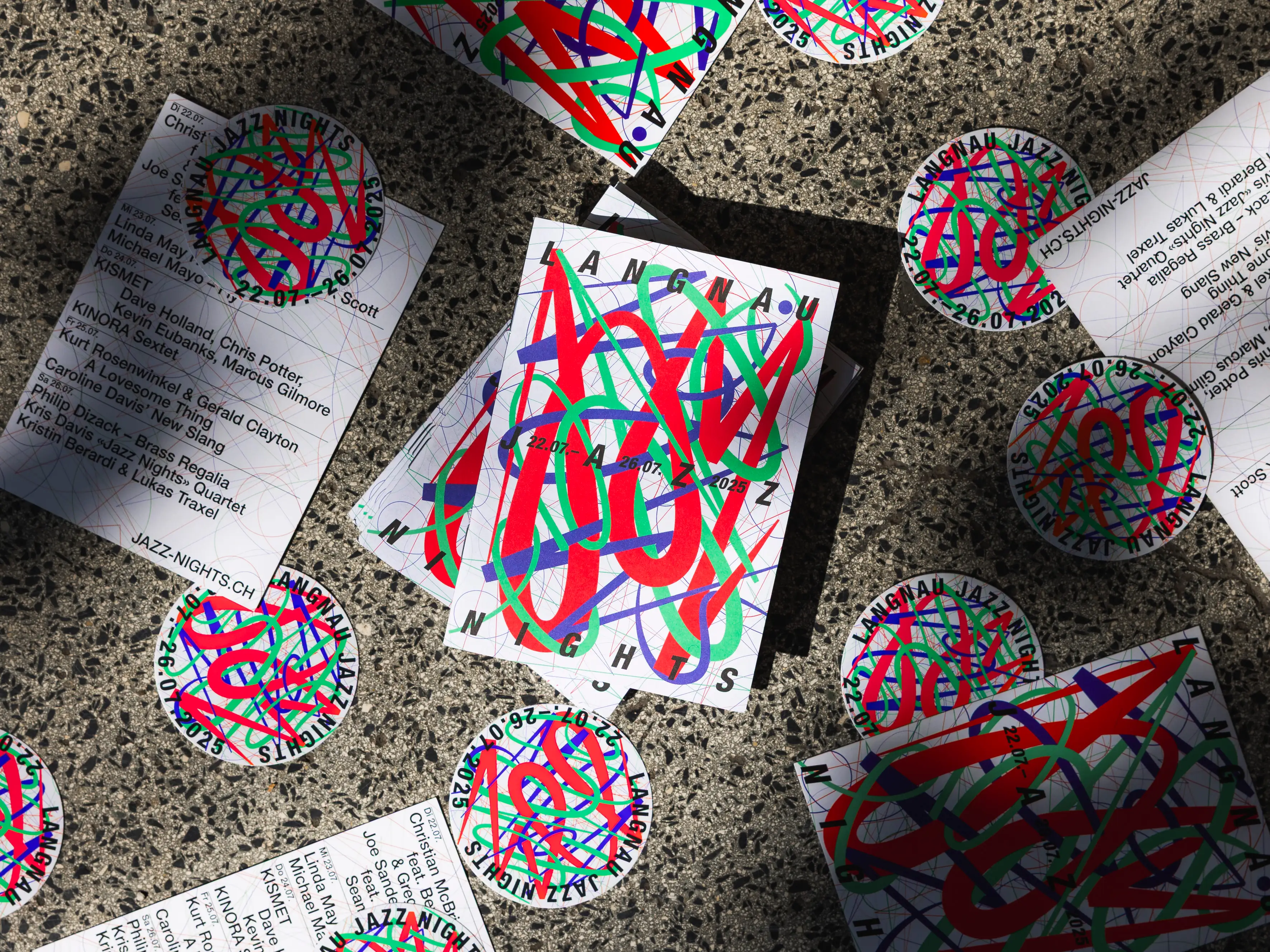 Every year, Langnau Jazz Nights transforms the Emmental region into a vibrant centre of international jazz culture. This lively atmosphere is reflected in the heart of the visual identity: the main visual shows the three intertwined words – Langnau, Jazz and Nights – as a playful, multi-layered network. In the background, different lines of varying thickness symbolise the space in which the music unfolds. The main visual stands for improvisation, rhythm and versatility of jazz and forms the basis for the entire visual identity of the festival. The design conveys complexity and excitement without losing the joy of playing and liveliness. The visual identity thus reflects the creative energy and character of the Jazz Nights on all levels.