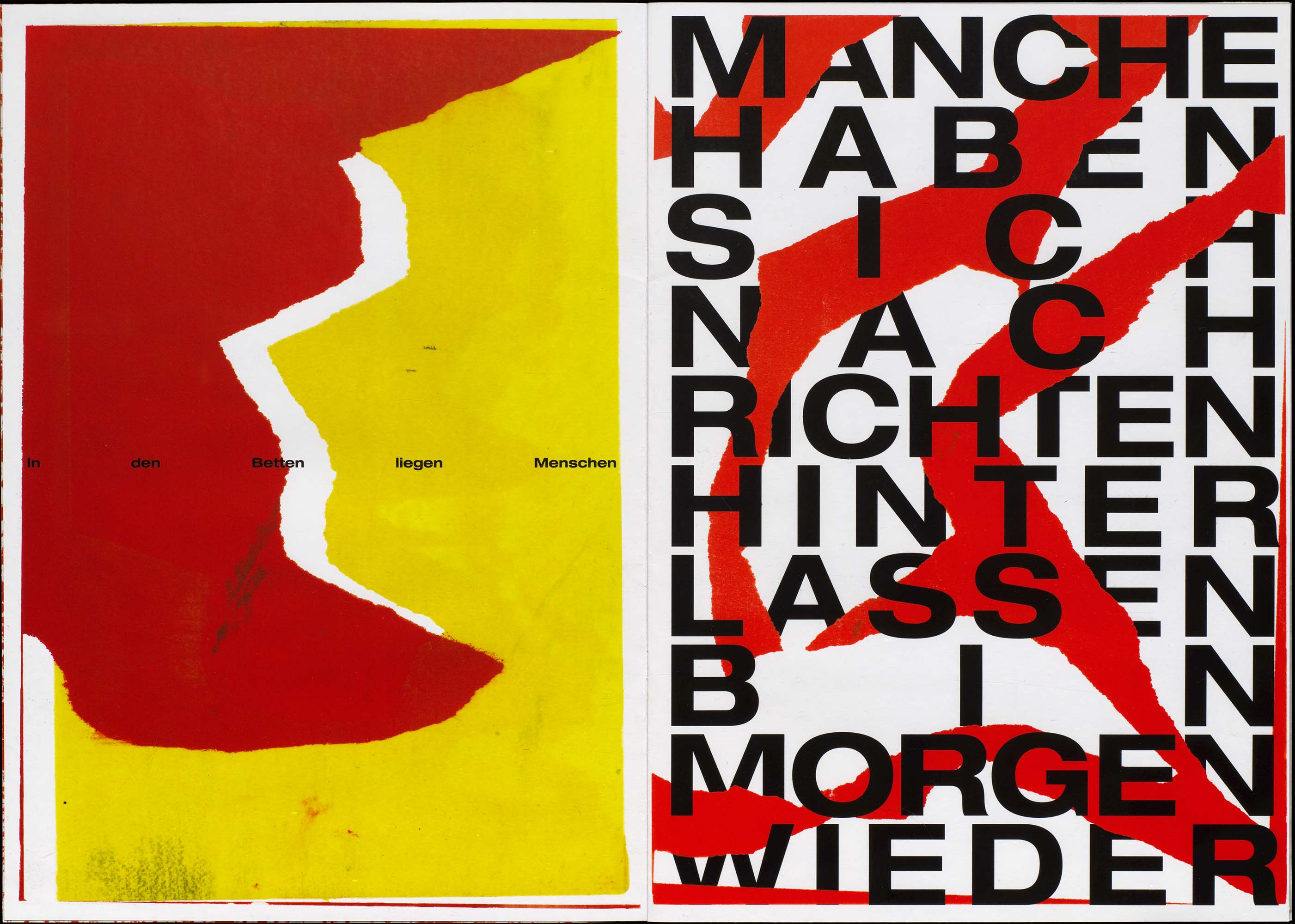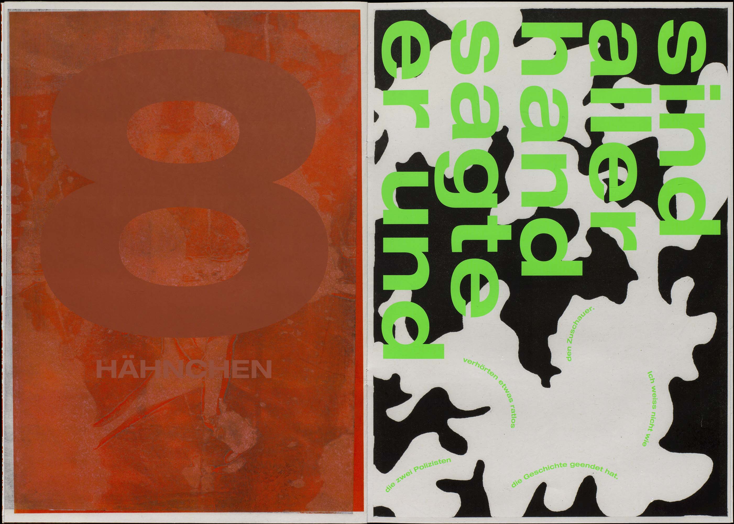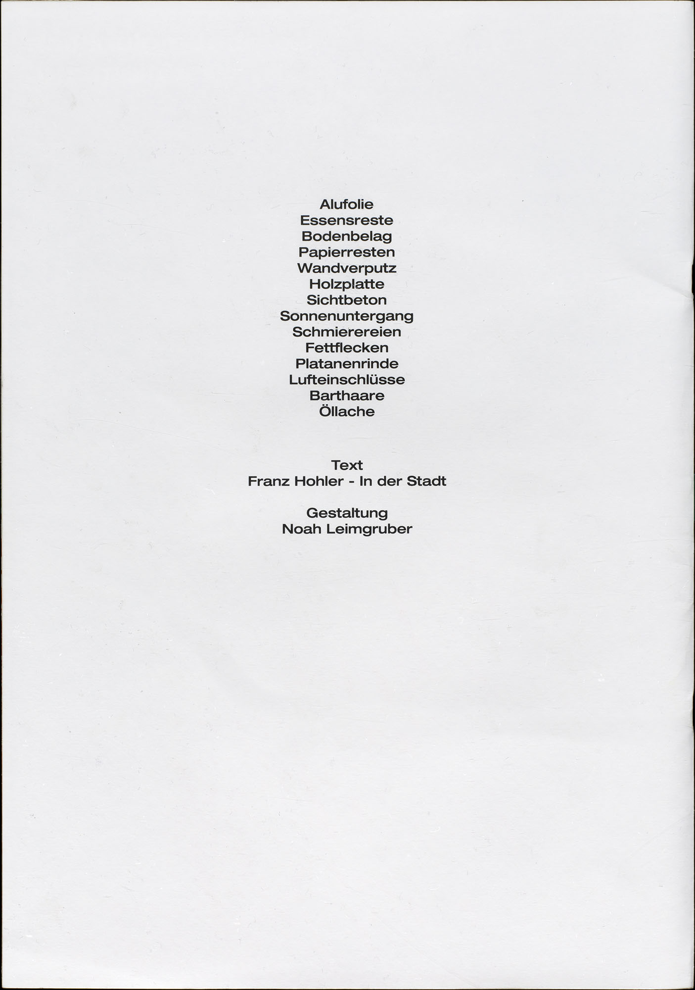 Photos of patterns, shapes, residues and abrasions found in the streets of Zürich served as inspiration for a pictorial reinterpretation using the monotype technique. The slow and sometimes random working method of this printing technique reflects the processes through which the photographed traces were created in the first place. The monotype prints were scanned and turned into a poster series using the helvetica typeface and the text «In der Stadt» by Franz Hohler. The result is an A3 magazine with 12 posters.
