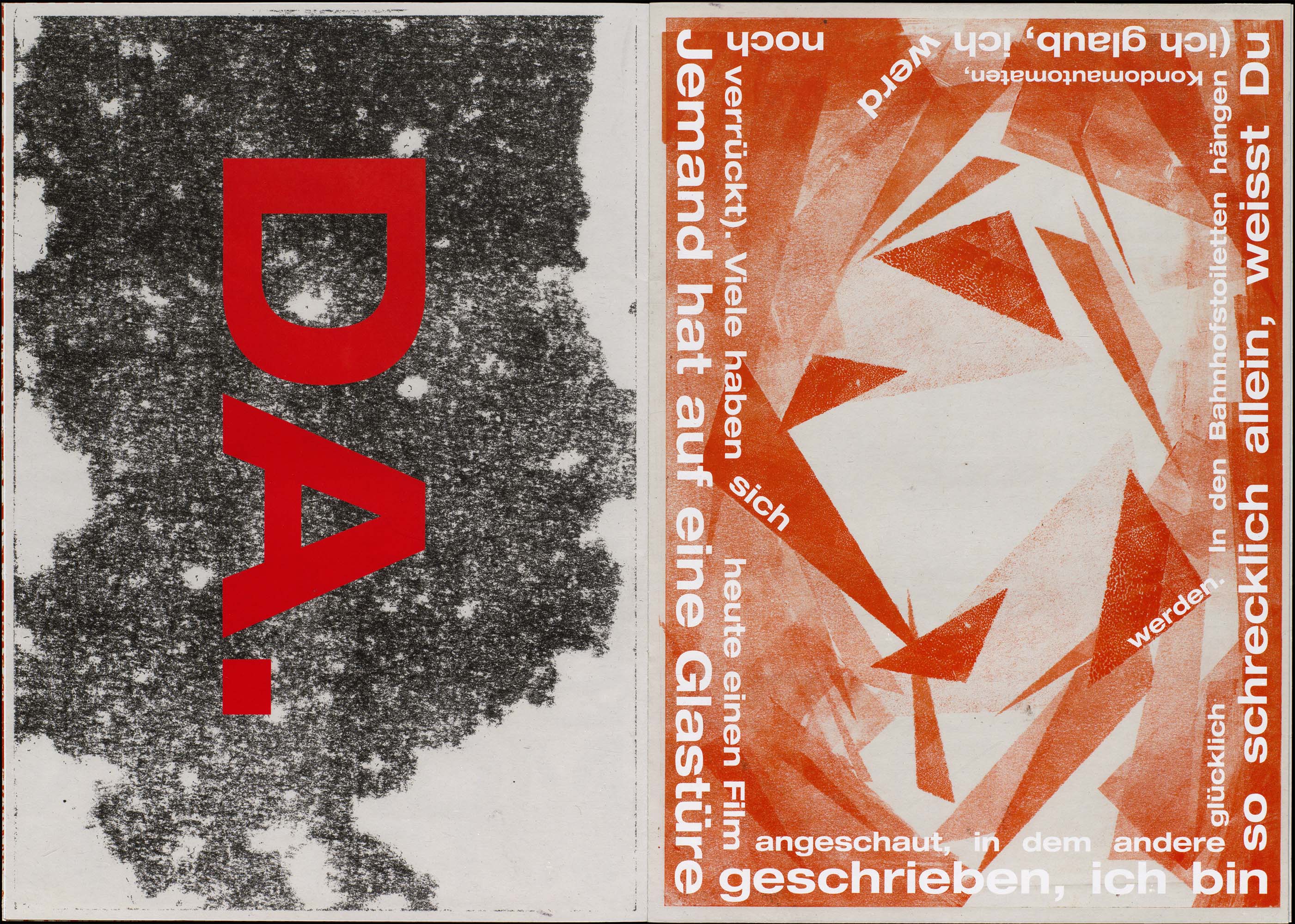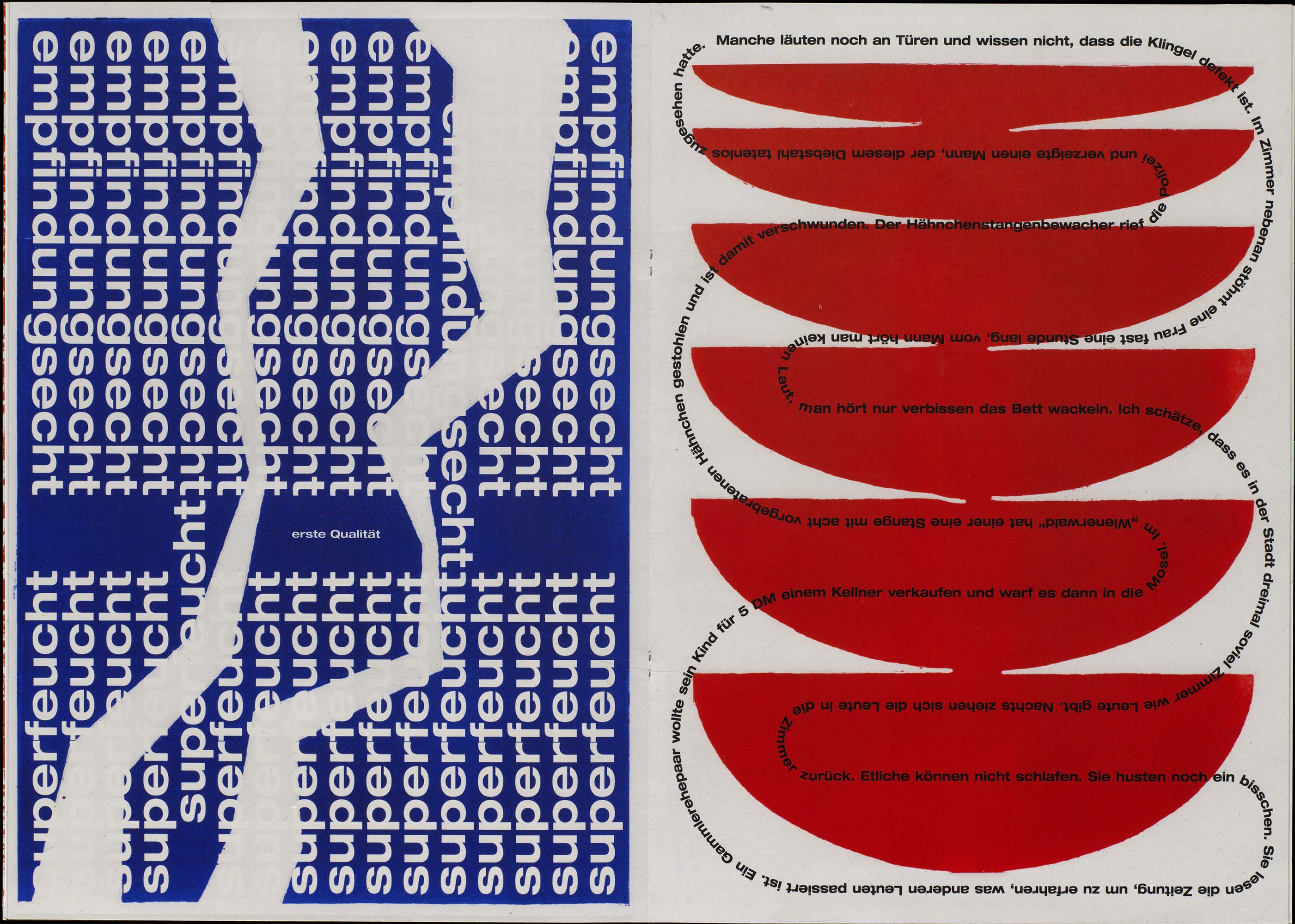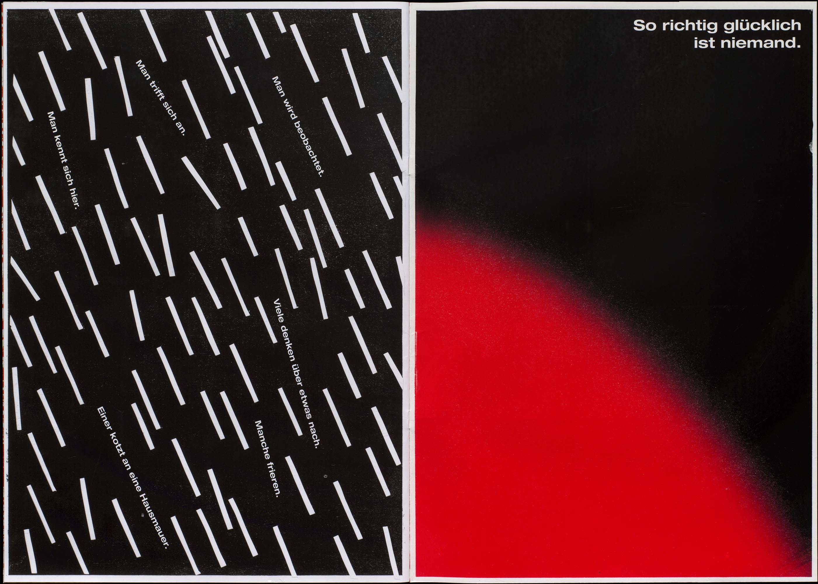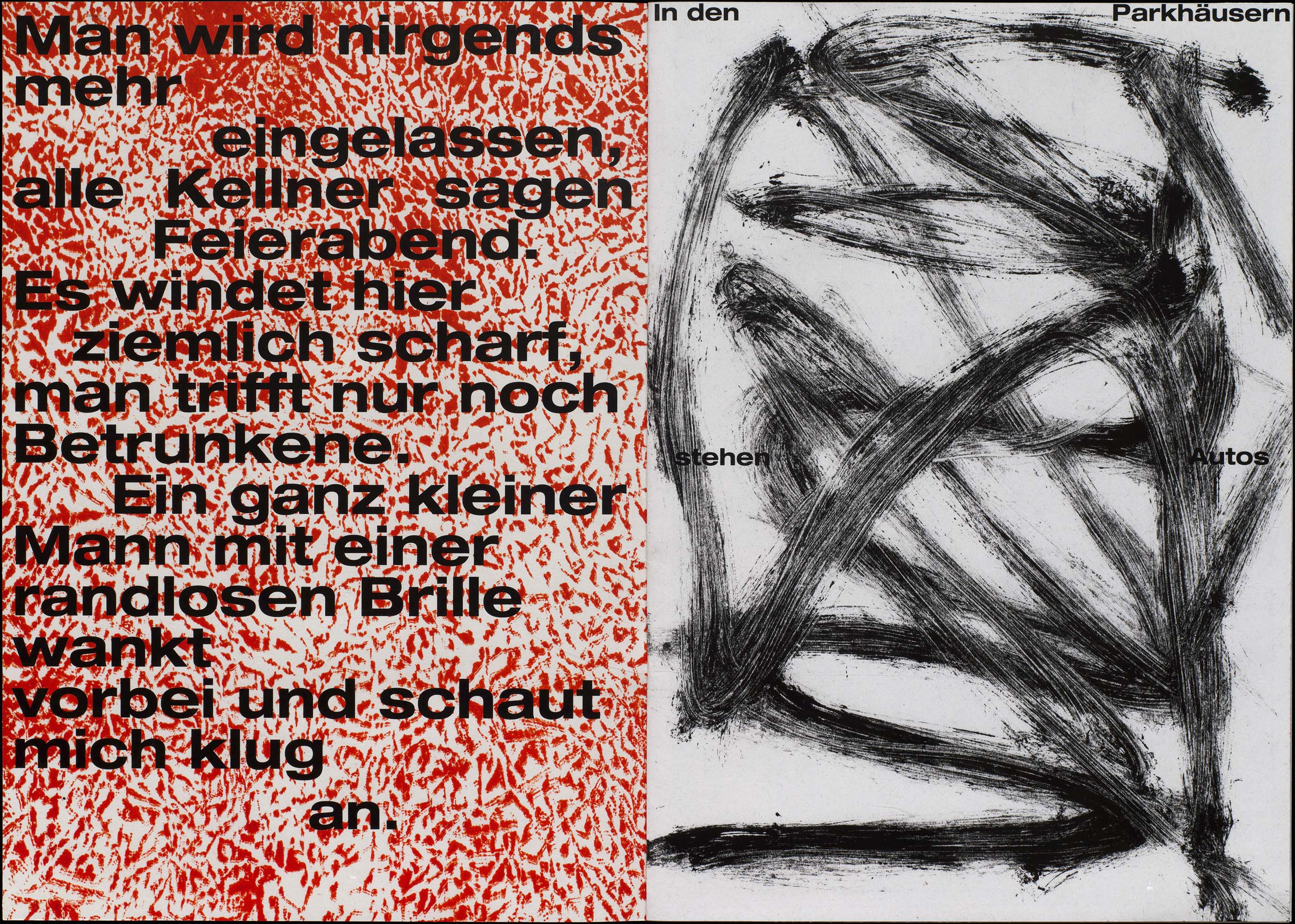 Photos of patterns, shapes, residues and abrasions found in the streets of Zürich served as inspiration for a pictorial reinterpretation using the monotype technique. The slow and sometimes random working method of this printing technique reflects the processes through which the photographed traces were created in the first place. The monotype prints were scanned and turned into a poster series using the helvetica typeface and the text «In der Stadt» by Franz Hohler. The result is an A3 magazine with 12 posters.